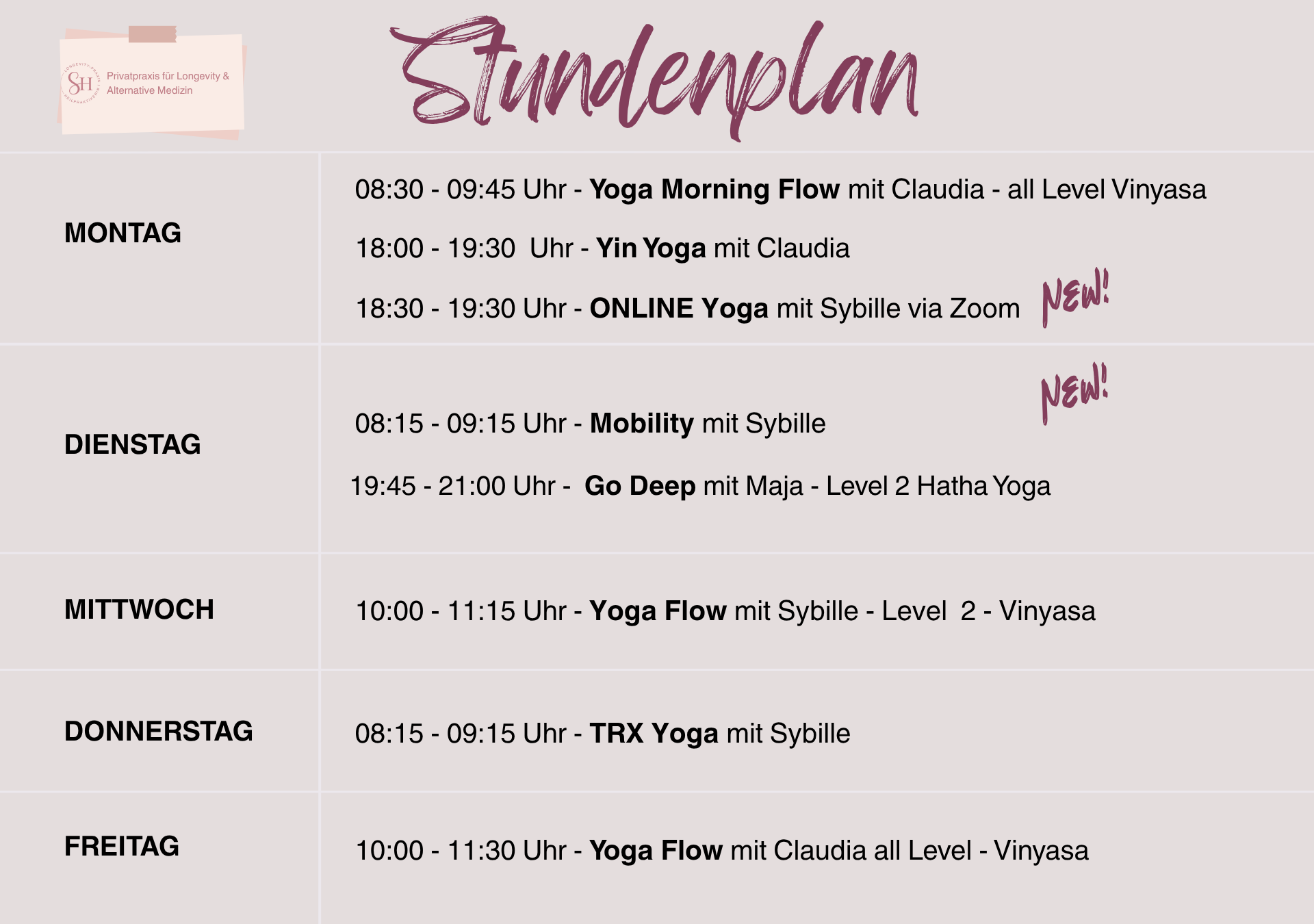 Mobility: Fans des Pilates und Yoginis kommen bei dieser Stunde auf ihre Kosten. Kraftvolle Corestärkende Übungen aus Pilates werden mit hilfreichen Elementen aus dem Yoga verbunden. Kraft, Ausdauer und Dehnung sind Schwerpunkte dieser Stunde. Damit wird das GUTE aus beiden Sportarten vereint.
