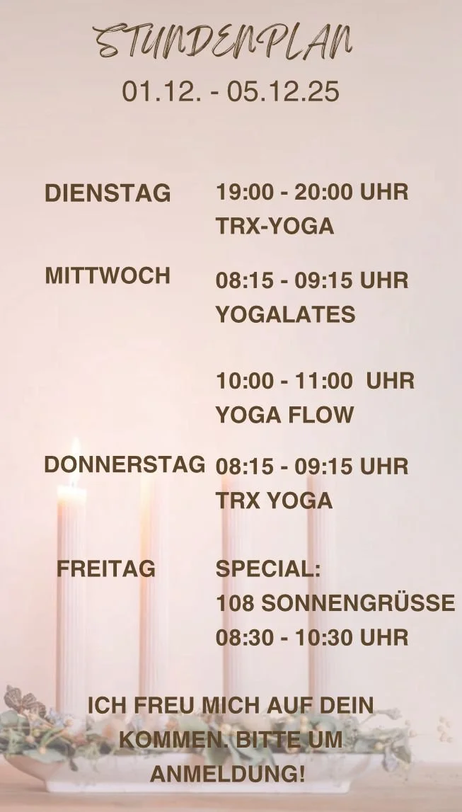 Auswahl der Stunde: Einfach eine What`s APP oder E-Mail unter 0172 - 266 09 95 oder sh@yogapraxis-gruenwald.de, schicken und der Platz ist reserviert.
